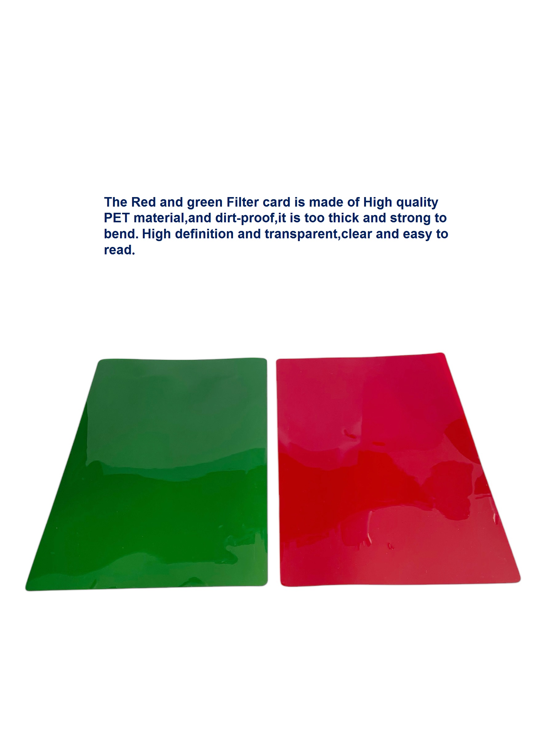 The Red and green Filter card is made of High quality PET material,and dirt-proof,it is too thick and strong to bend. High definition and transparent,clear and easy to read.
